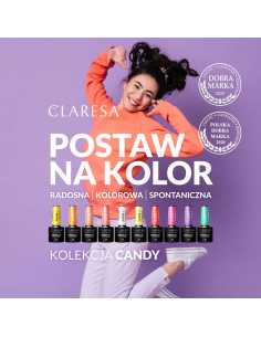 Tragen Sie eine dünne Schicht farbigen semipermanenten Lack auf den zuvor ausgehärteten Claresa semipermanenten Basislack auf und härten Sie ihn unter einer UV-/LED-Lampe aus. Sie können den Vorgang wiederholen, um einen zufriedenstellenden Effekt zu erzielen. Fixieren Sie die Frisur, indem Sie Claresa TOP auftragen und aushärten.
