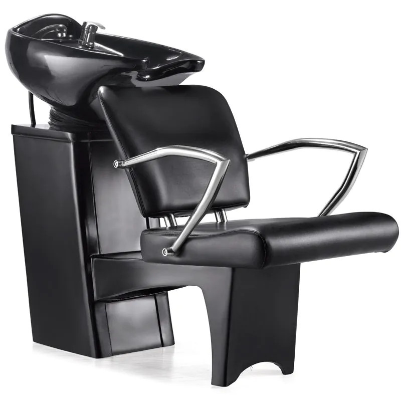 Professional black Shampoo unit with a tilting black basin, metal armrests, and an ergonomic seat. Designed for modern hair salons seeking client comfort and professional durability.