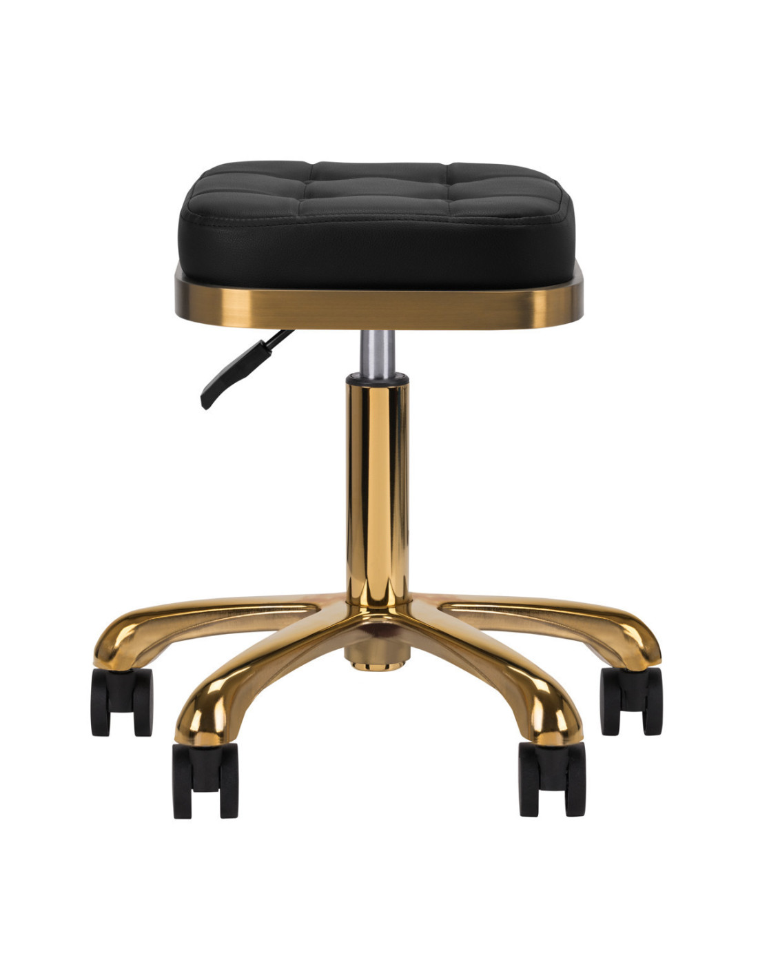 Elegant black stool with padded seat and gold finish, height adjustable, and a mobile base with wheels. Ideal for beauty and wellness professionals.