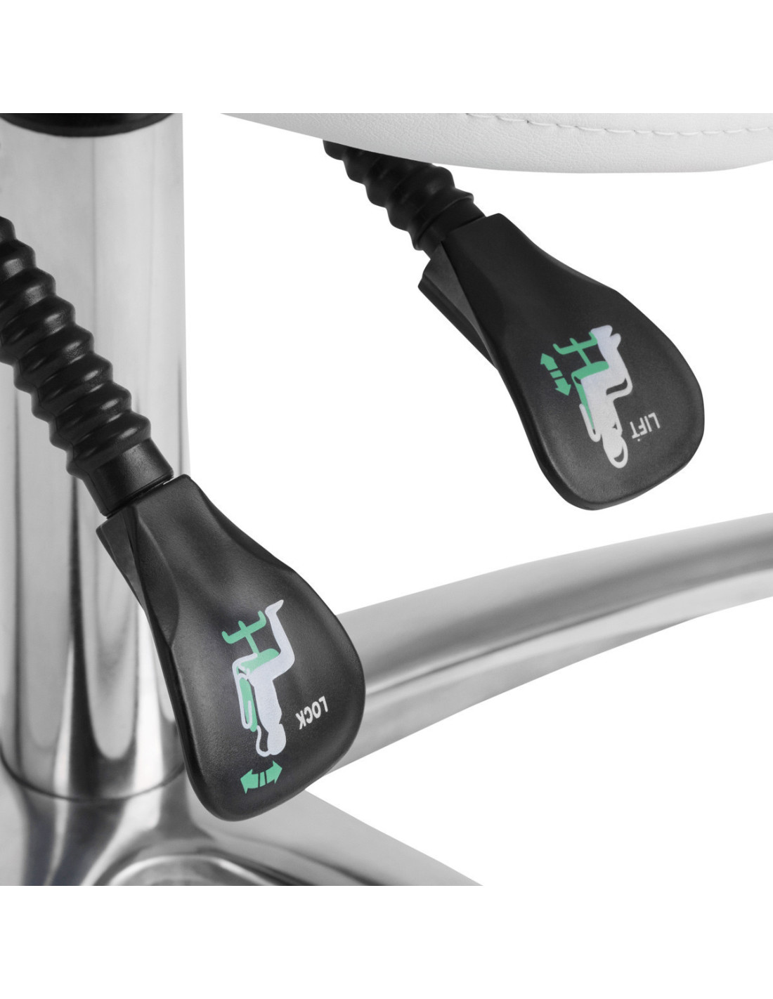 Adjusting the height of a hydraulic pump hairdressing stool is quick and easy. This system allows the seat to be adjusted to the hairdresser's height and the height of the workstation for optimal comfort.