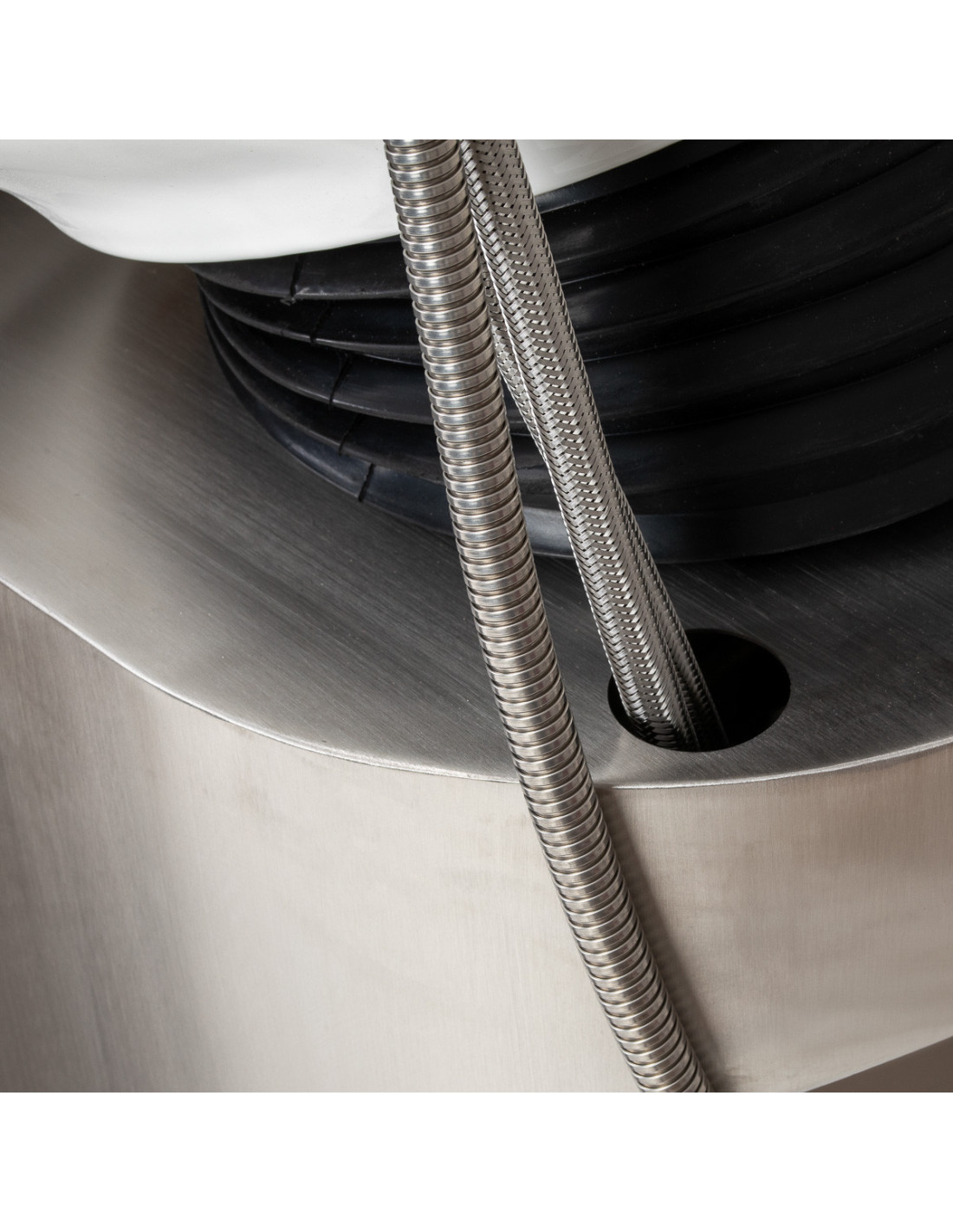 La colonne arrière en inox dissimule les raccords d’eau pour une esthétique parfaite. Un panneau de maintenance amovible permet un accès facile en cas de besoin.