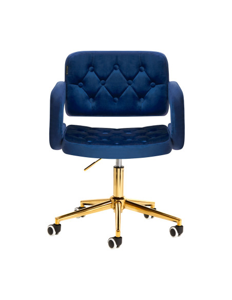 Agréable au toucher, le revêtement en velours dans les tons bleu marine confère au meuble un caractère unique. La finition rend le meuble accrocheur. Le cadre dans les tons dorés ajoute de l'élégance, s'accordant parfaitement au velours. Les roues fonctionnelles assurent la mobilité, facilitant le déplacement de la chaise et les déplacements dans le salon tout en travaillant. L'esthétique de la fabrication, le confort d'utilisation, le matelassage décoratif et le dossier ergonomique permettent à la chaise de répondre aux exigences des utilisateurs les plus exigeants.