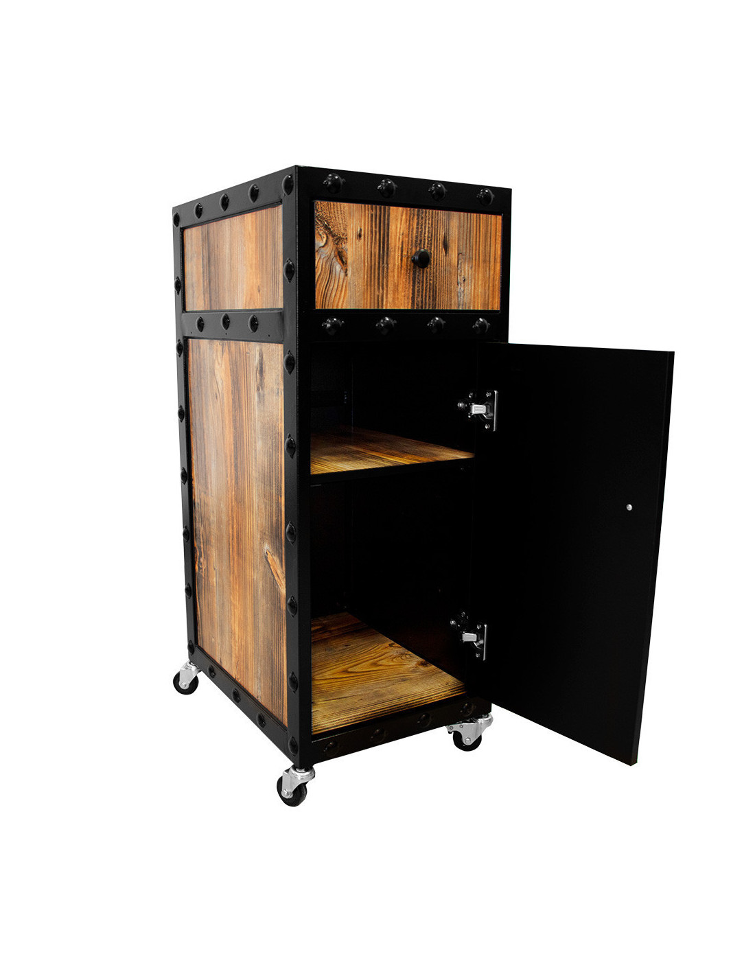 Le Chariot de coiffure salons barbiers industrielle est un ajout pratique et élégant à tout salon de barbier. Sa structure métallique noire et ses panneaux de contreplaqué offrent à la fois durabilité et style.