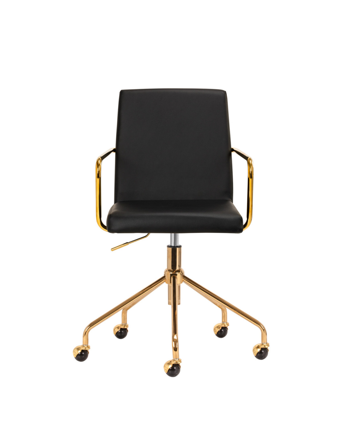 Agréable au toucher , le revêtement en cuir synthétique dans des tons de noir confère au meuble un caractère unique. La finition élégante rend le meuble accrocheur. Le cadre dans les tons dorés ajoute de l'élégance, s'adaptant parfaitement aux formes simples. Les roues fonctionnelles offrent une mobilité importante, facilitant le déplacement de la chaise et les déplacements dans le salon tout en travaillant. L'esthétique de la fabrication, le confort d'utilisation et le dossier ergonomique permettent à la chaise de répondre aux exigences des utilisateurs les plus exigeants.