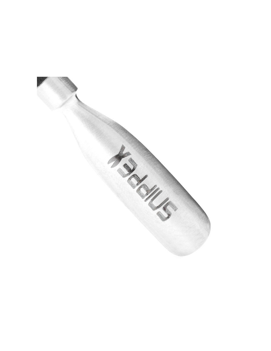 Pala per manicure a doppia faccia. Un lato con estremità semicircolare per spingere indietro le cuticole, l'altro lato appuntito, per pulire il bordo dell'unghia. Il perno scanalato nero facilita il lavoro. Adatto per la disinfezione.