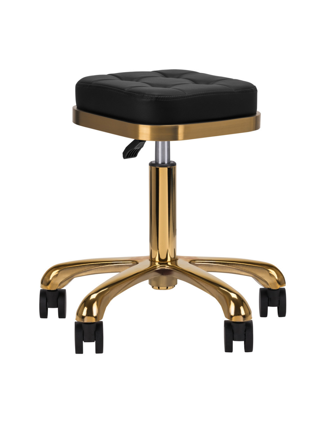Elegante banco preto com assento acolchoado e acabamento dourado, com altura ajustável e base móvel com rodinhas. Ideal para profissionais de beleza e bem-estar.